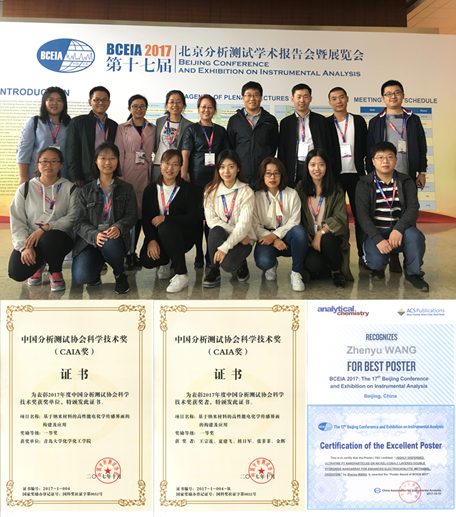 王宗花教授率领团队成员及研究生参加了此次国际会议。领取中国分析测试协会科学技术奖(CAIA奖)一等奖,并将团队近期成果以口头报告和海报的形式进行了展示。会议期间,2015级分析化学专业研究生王桢玉的论文(Highly dispersed ultrafine Pt nanoparticles on nickel-cobalt layered double hydroxide nanoarray for enhanced electrocatalytic methanol oxidation)荣获最佳海报奖(Best Poster,中国分析测试协会和美国化学会颁发获奖证书)。