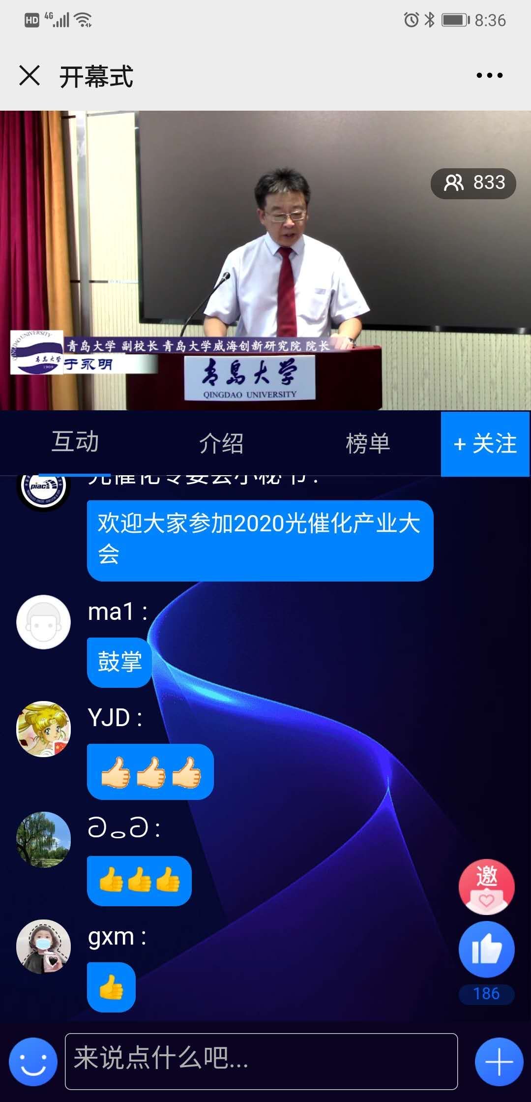中国感光学会光催化专委会主任、清华大学朱永法教授代表专委会发言,他表示非常喜欢本次大会的形式,也很期待参与本次大会的专家学者所带来的精彩报告。小蓝视频