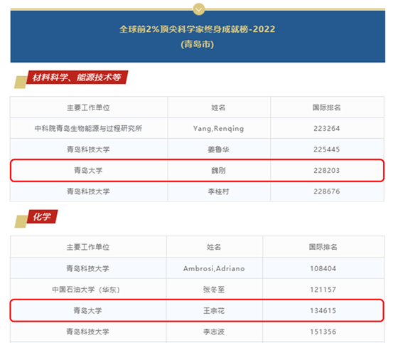 王宗花教授(国际排名134615)、魏刚教授(国际排名228203)位列其中,两位教授分别在化学、材料科学领域做出了突出贡献。