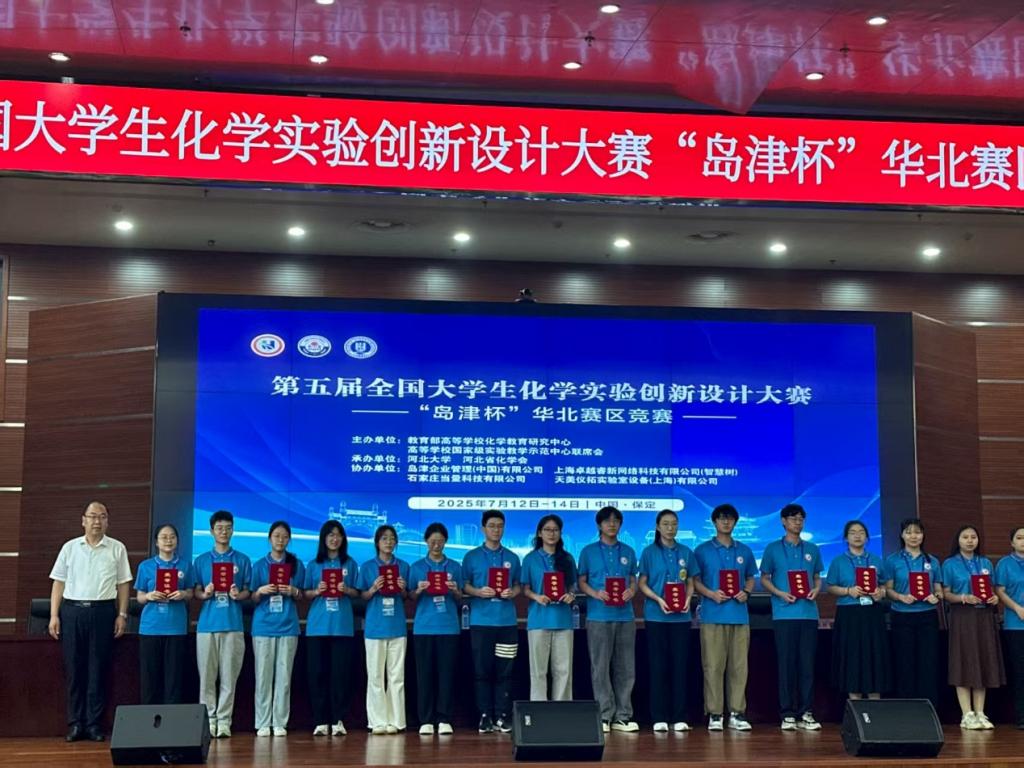 一项参赛作品《pH编程型防污双金属纳米酶阵列传感器用于水果成熟度的评估》(团队成员:赵质斌、邢玉凯、李家麒,指导老师:海欣、毕赛)获得华北赛区竞赛一等奖、两项参赛作品《基于荷叶仿生原理的水下微油滴三维操纵树脂器件》(团队成员:毕晨阳,李怀娇,潘文凯,指导老师:熊忠)、《苯甲醛的高效绿色氧化-一个改进型大学化学综合实验》(团队成员:张亦硕,朱锴迪,王双悦,指导老师:赵立兴)获得华北赛区竞赛三等奖。