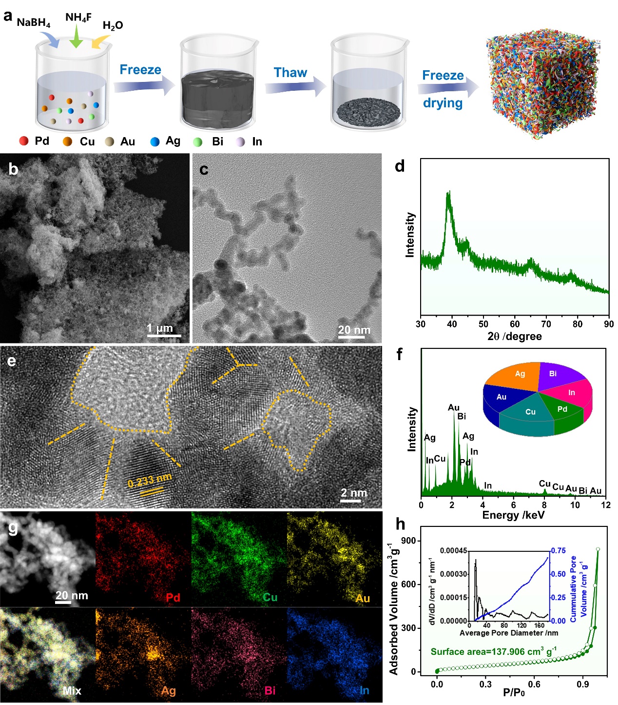图1. PdCuAuAgBiIn高熵合金气凝胶的形貌和结构表征
