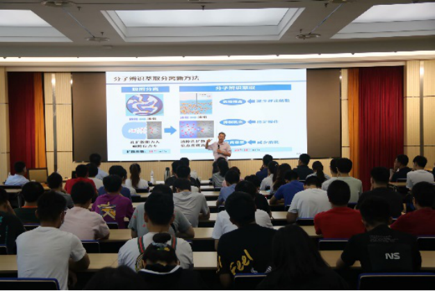 任其龙院士主要从事化工分离技术领域的应用基础和工程实践研究,报告向大家介绍了化工过程中的分子识别和分子辨识基础理论,分子辨识技术在天然产物分离,干气体分离以及腈纶溶剂分离中等领域的应用,特别是天然活性物质/同系物的分子辨识分离运用,开发了高活性天然维生素E、羊毛脂活性物质、长春瑞滨等的工业化生产技术。报告结束后,任院士与在场师生进行了互动交流,耐心解答了大家所提出的天然相似结构识别中离子液体溶剂的工业化存在的问题。