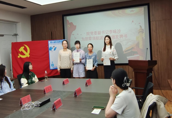 院党委副书记李咏沙为朋辈领航团代表颁发聘书,其后,朋辈领航团代表刘阳进行发言,她表达了对师弟师妹的诚挚祝福,同时表示,会认真执行朋辈领航团的任务,发挥党员先锋作用和帮扶作用。随后,孟丽为朋辈领航团成员们颁发了纪念品,成员们依次在纪念板上进行签名留念。