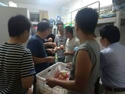 今年的中秋节,是同学们第一次不能和家人团聚的中秋节,尤其对省外的同学来说,思乡之情更加浓厚。而老师和学长学姐们的到来,给思乡心切的他们送来了温暖和关怀。美味的月饼代表着化院学子在一起团团圆圆过中秋,而红红的苹果则寓意着平平安安。老师们亲切的问候让远离家乡的同学们感受到了如家般的温暖,学长学姐们幽默风趣的聊天则给疲惫中的同学们带来了欢声笑语。老师们对同学们的宿舍情况和精神状态进行了慰问,对中秋节仍在坚持军训的同学们进行了表扬,并嘱咐他们要多注意身体,饮食要营养搭配,并且对接下来的军训生活进行了鼓励,学长学姐们对新生的问题及时做出了解答,让新生的身边多了一份依靠。新生们对老师和同学的到来感到十分感动,对老师和学长学姐带来的惊喜表示了感谢,纷纷和老师们合影留念。