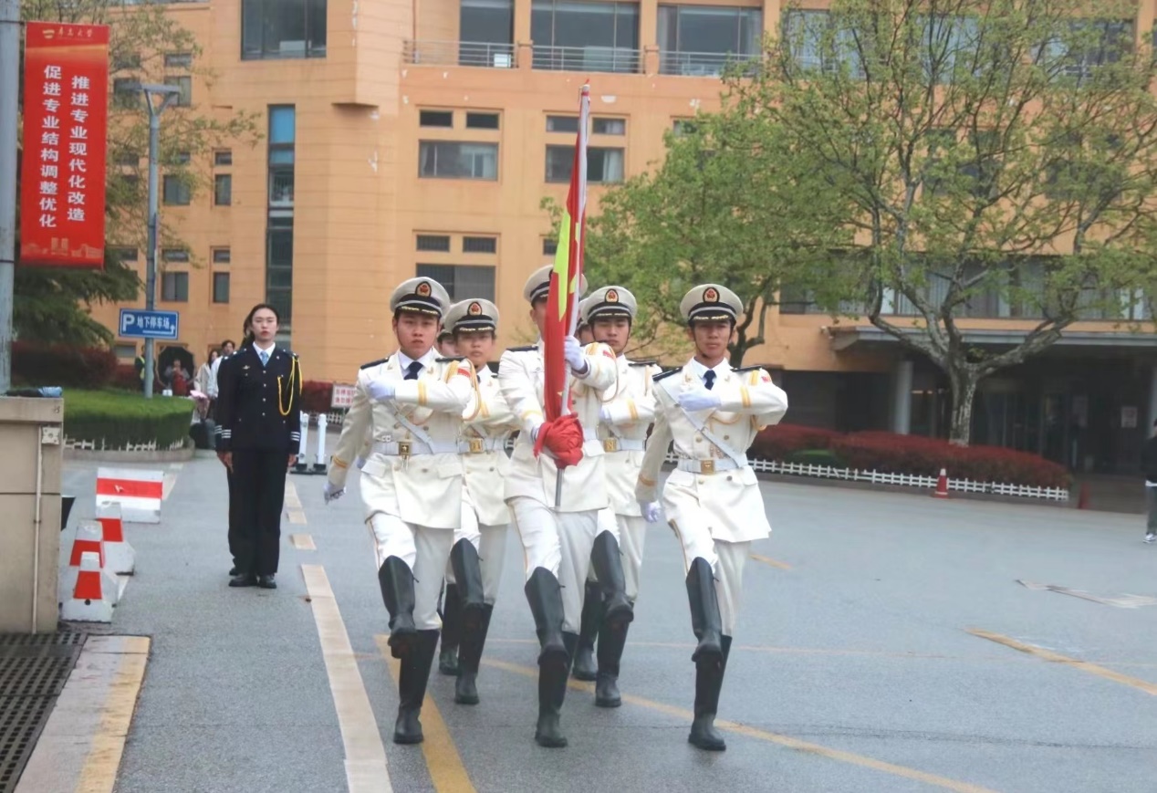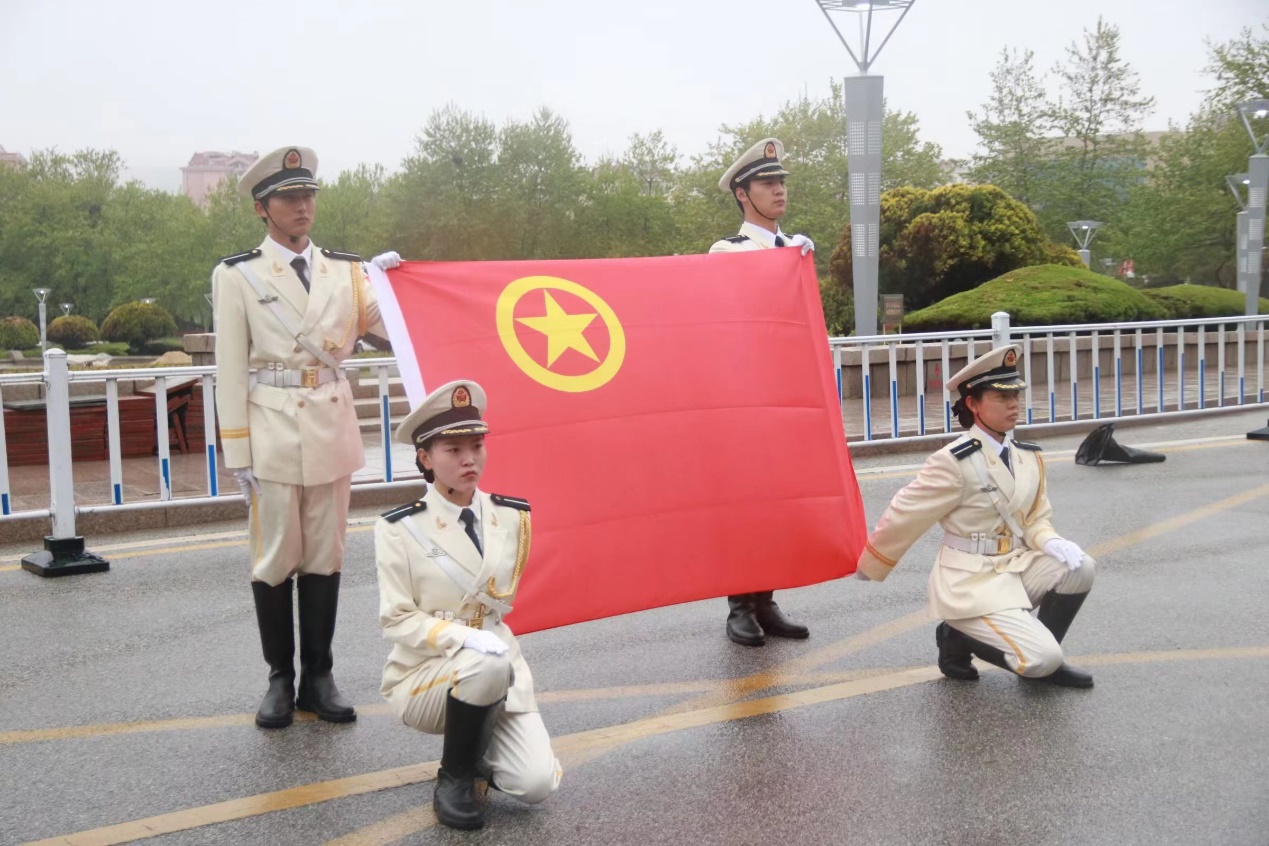 伴随着国旗班队员们铿锵有力的步伐,五四升旗仪式拉开序幕。国旗班队员们昂首阔步,意气风发,以饱满的精神状态走向国旗台。笔挺的军姿,有力的摆臂,坚定的脚步,展现出时代青年昂扬的风采。
