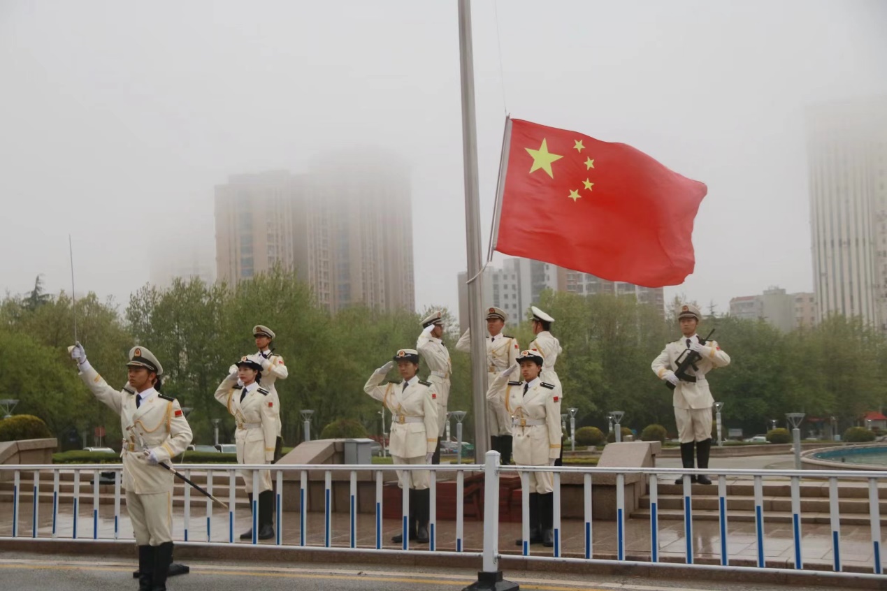 在浮山校区图书馆前广场举行庄严而肃穆的升国旗仪式,学校两百余名师生代表相聚于此,致敬青春。