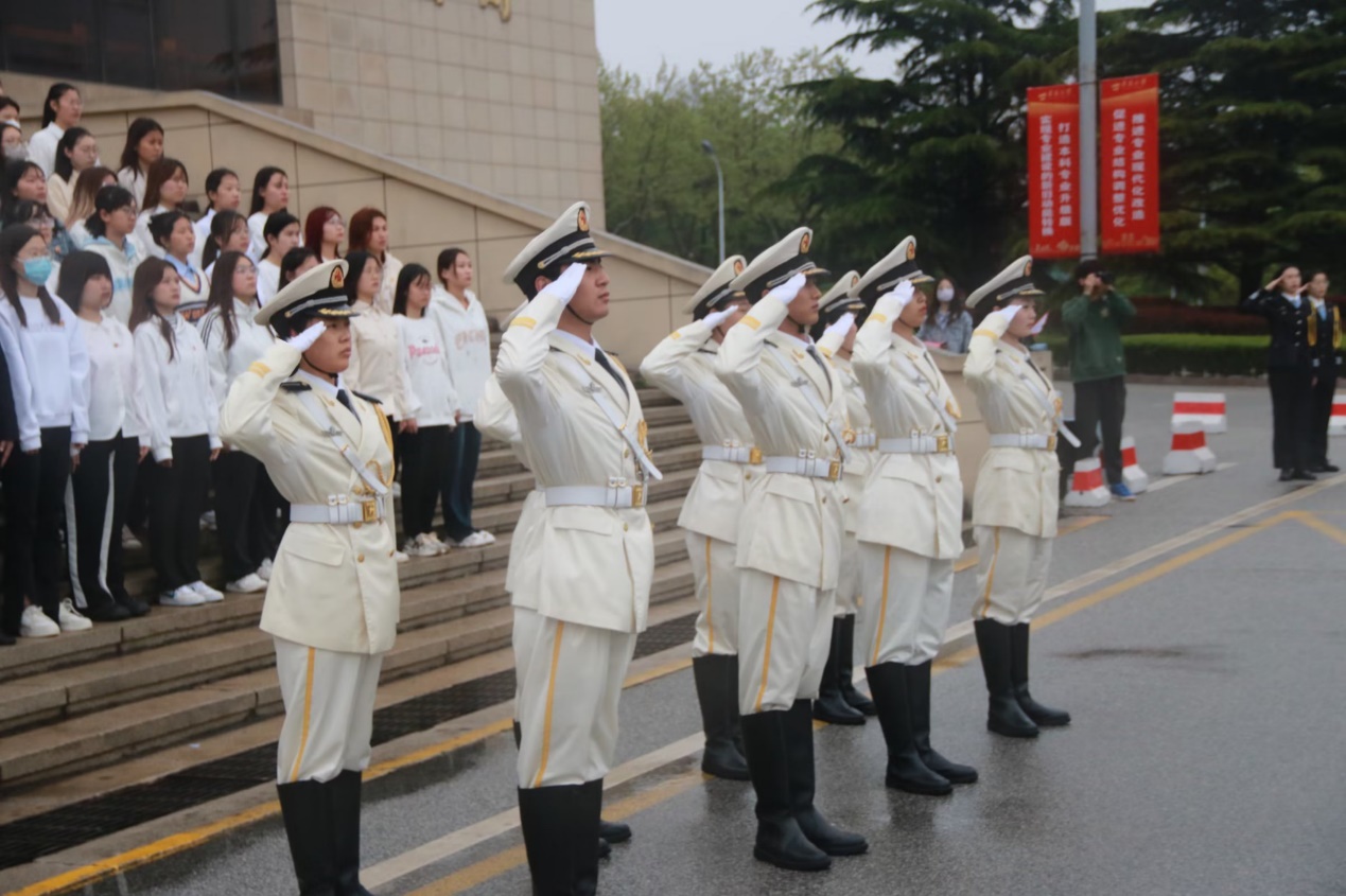 在浮山校区图书馆前广场举行庄严而肃穆的升国旗仪式,学校两百余名师生代表相聚于此,致敬青春。