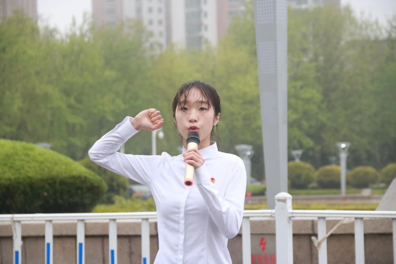 在殷红鲜艳的团旗下,朱文静同学带领大家举起右拳,集体宣誓,重温入团誓词,用坚定的誓言表达一名共青团员的使命和担当。